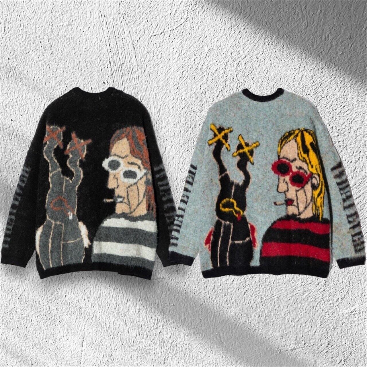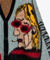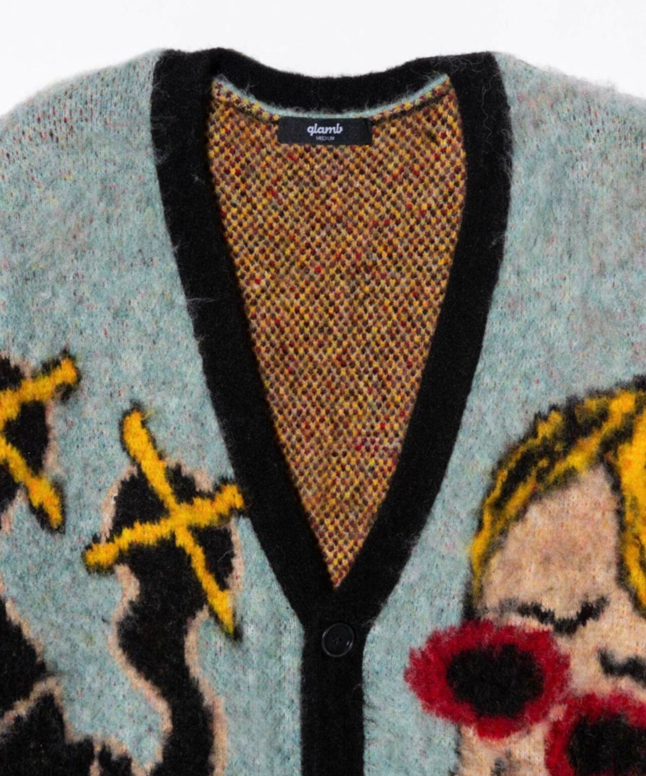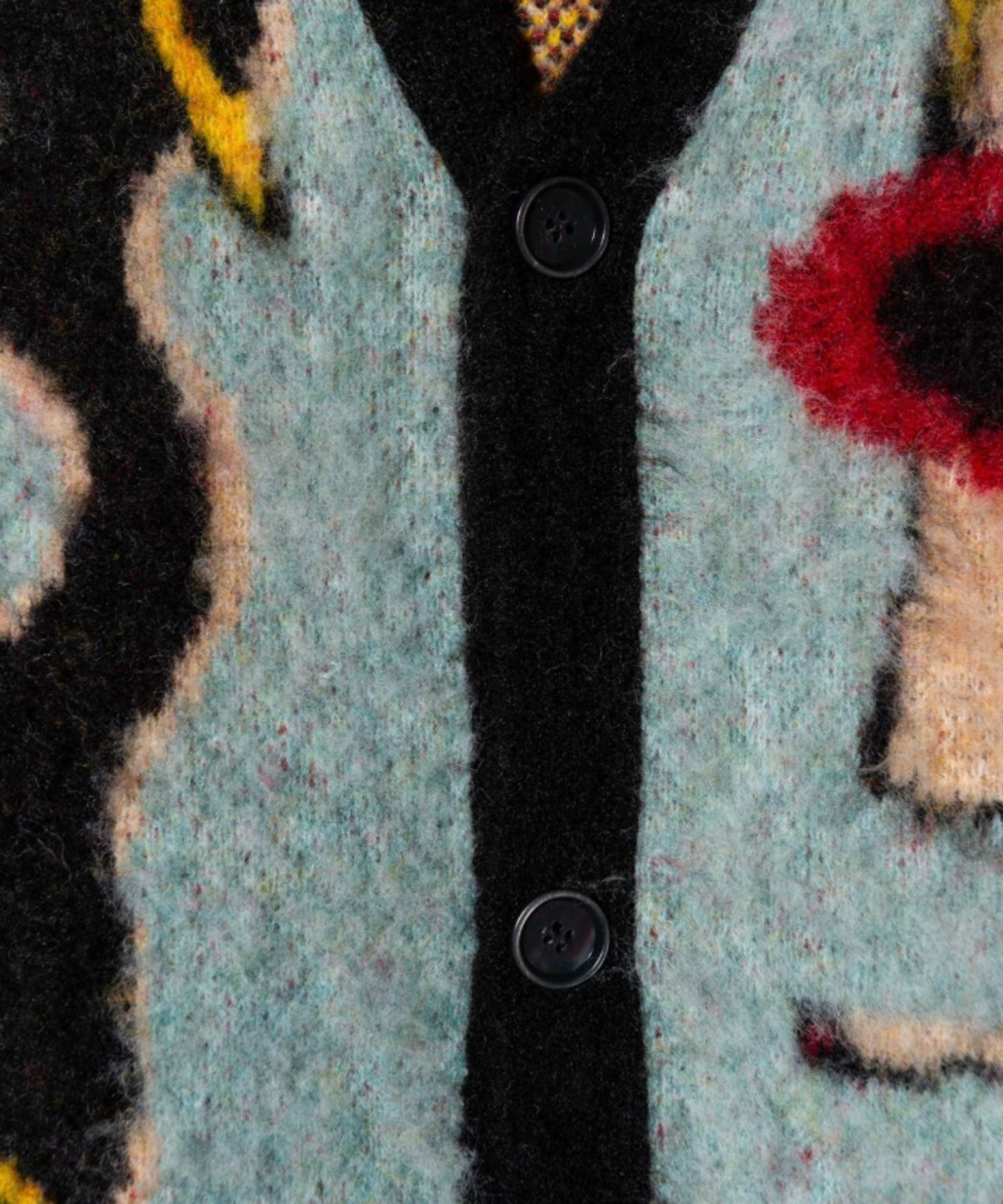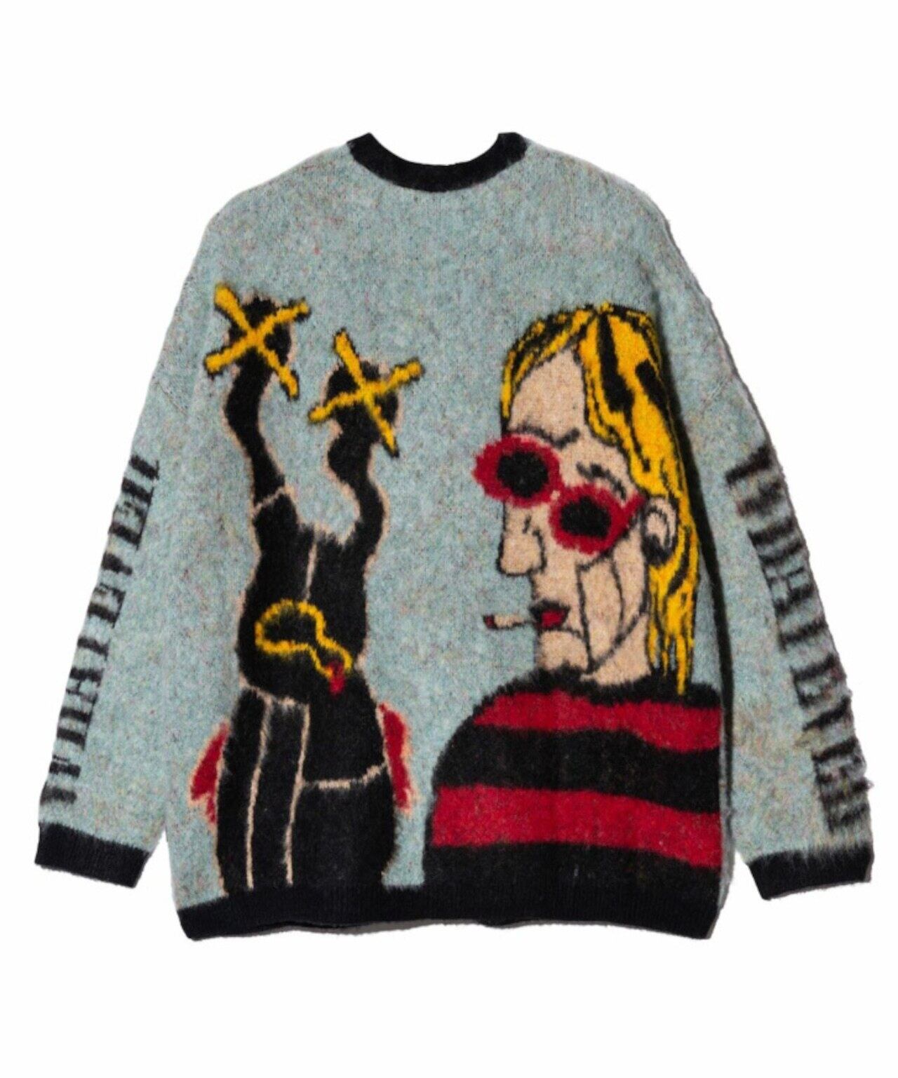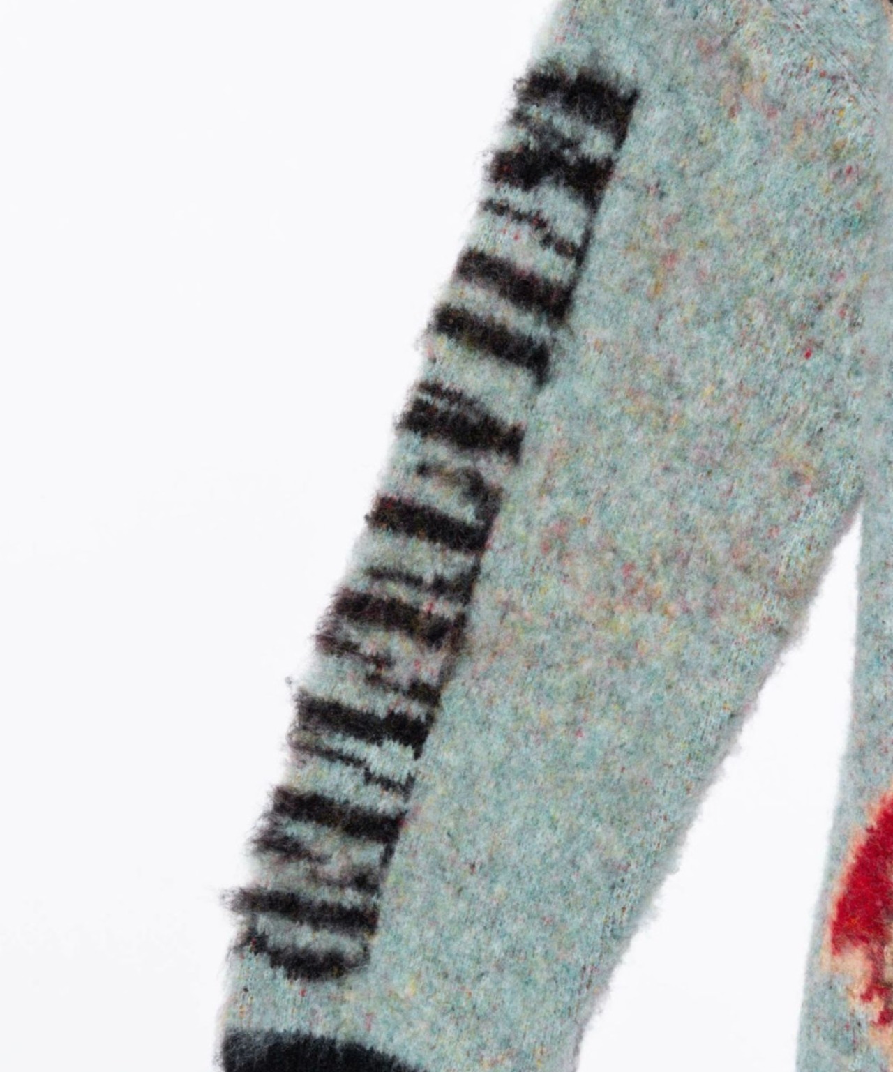 グランジカルチャーへの憧憬にフランス抽象画のエッセンスをかけ合わせ、エスプリある佇まいを形作ったWeeping Man Cardigan。身頃にジャガードで描かれたのはグランジファッションに身を包んだ金髪の男と摩訶不思議なキャラクター。キュビズム的なタッチで、身頃の前後に同じ柄を同じ配置であしらった大胆なレイアウトとなっています。テキスタイルにはタム糸を使用し、仕上げに起毛加工を加えてモヘア調の起毛感を演出。ボディはドロップショルダーとルーズな身幅を組み合わせ、ストリートやグランジといったスタイリングに対応するシルエットにまとめています。