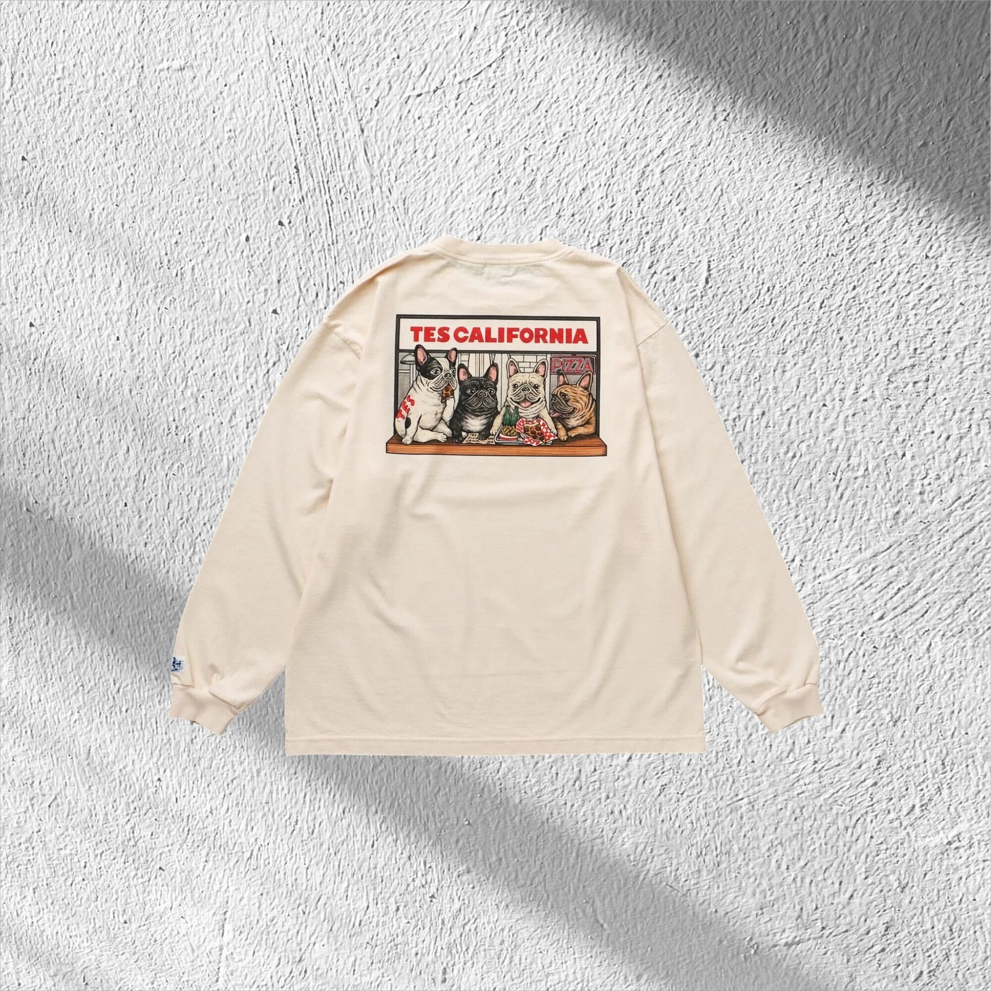 洗い晒しの様な風合いが特徴のアメリカンコットンを忠実に日本生産にて再現したオリジナルヘビーウェイト天竺を採用したロンTです。 度目を詰めながらも柔らかさを出し、堅牢さを兼ね備えた抜群の着心地に仕上げています。 カリフォルニアのピザダイナーをイメージしてデザイン、4BUHIのスタッフが魅力! 生地・縫製全て日本製で仕上げています。