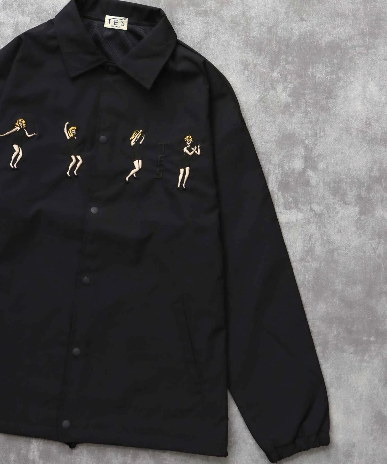 1960年代に流行したゴーゴーダンサーを刺繍で表現したユニークなコーチJKTが登場。 ややマットな質感の肌触りの良い素材を使用したコーチジャケットが登場。 裏地はメッシュを使用、適度な保温性は季節を問わず着用できるアイテムです。 ベーシックなカラーリングで着まわしやすいアイテムです。