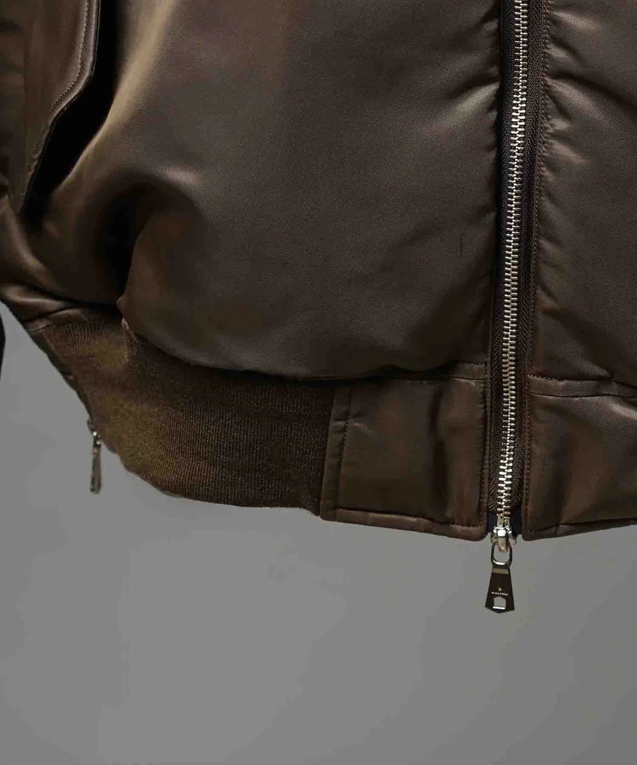 ナイロンの綾織物でミリタリー生地の定番素材である「ナナマルニヒャクトーツイル」を、実際の米軍や自衛隊のフライトジャケットを解析し、ジッカー染色機で染色することでナチュラルかつふくらみのある風合いに仕上げており、更にコールドシレー加工を施すことで布地の気密性を高めて光沢感を引き出しております。