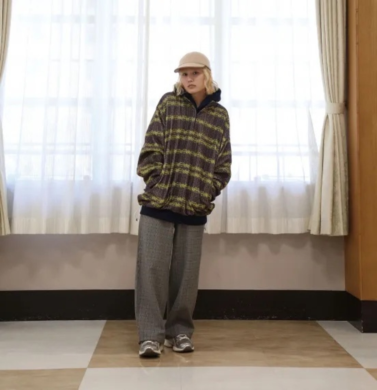 ボーダーニット柄を転写プリントした別注生地を使用したプルオーバーニット。表面は起毛素材で裏側はメッシュ編みのため肌触りがよく、快適な着用感となります。袖リブにはベロア調のコーデュロイニット生地を採用しています。裾のドローコードで着丈、シルエットを調節可能。